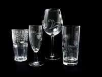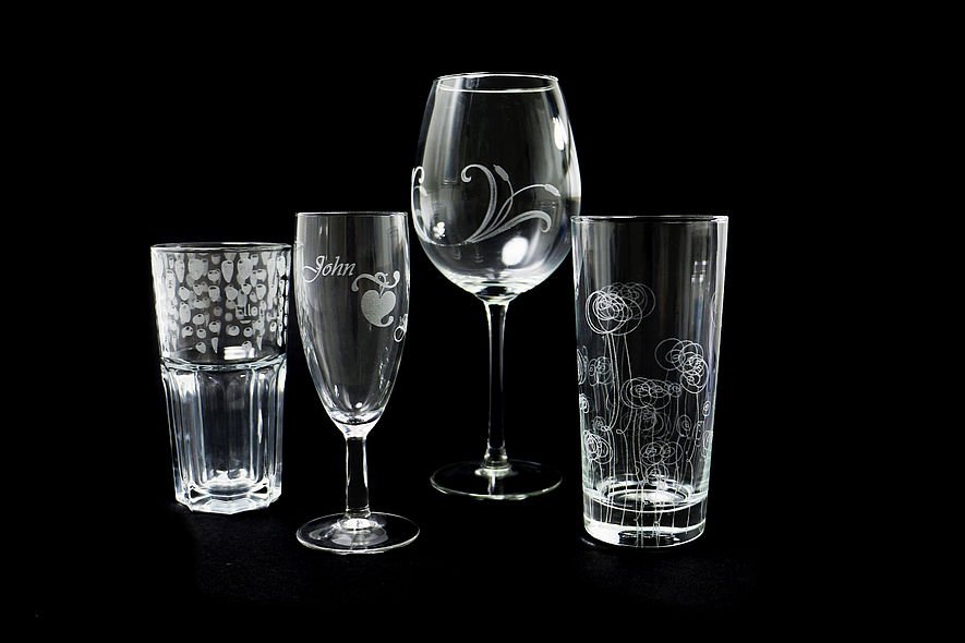 Simplicidade e precisão na gravação a laser em vidro com máquinas de gravação a laser da UltraSilk. A gravação a laser sobre vidro produz um efeito fosco fascinante. É possível gravar fotos, textos ou logotipos com contornos e detalhes extremamente finos em taças de vinho ou champanhe, canecas de cerveja, garrafas, espelhos ou vidros para janelas. A gravação a laser sobre vidro é uma excelente opção para a confecção de brindes personalizados e memoráveis para festas ou eventos corporativos.